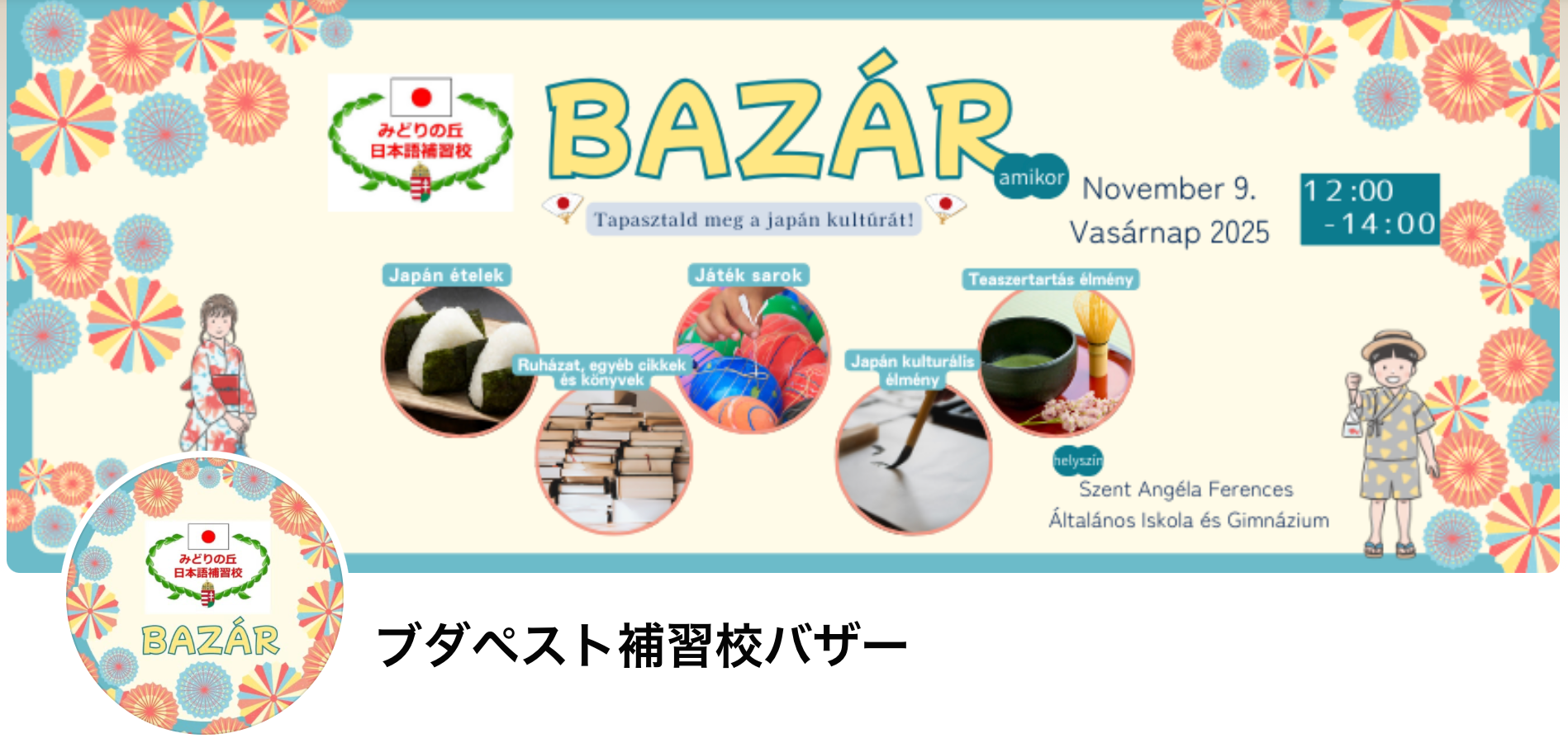 【お知らせ】 2025年度「みどりの丘日本語補習校バザー」を開催します! 日時:2025年11月9日(日)12:00~14:00 場所:Szent Angéla Ferences Általános Iskola és Gimnázium Budapest, Ady Endre u. 3, 1024 Zivatar utca入口